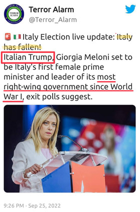 Unfortunately, Giorgia Meloni is the "Italian Trump." And I can't take credit for that, as it's already filtered through the news and across social media. She is not a part of the Globalist establishment, so the media must now convince you and the rest of the world that she's a.....wait for it......FASCIST. The fear-mongering, smear stories are already out, complete with the comparisons to none other than Benito Mussolini. Giorgia Meloni can't be controlled by the establishment, so they must deploy all of their media tactics to destroy her.