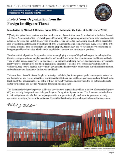 This is an official statement from the Office of National Counterintelligence Security - Link to DNI.gov. Full Report Pages Below.